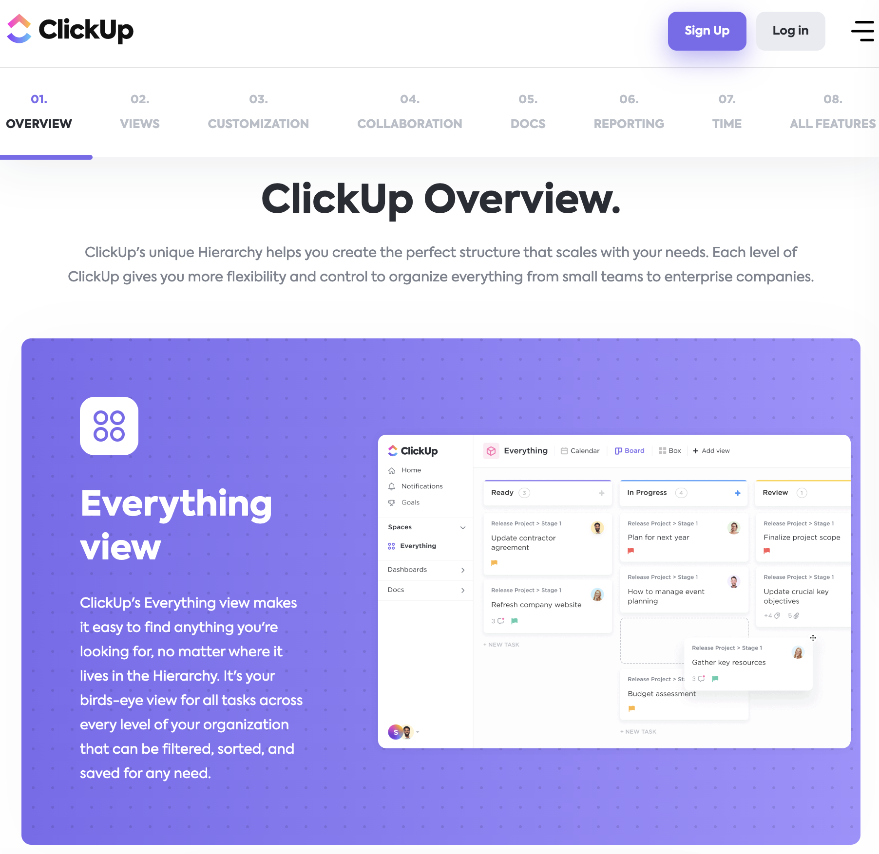 ClickUp, a project management suite, treats its product information as copywriting projects. The use of "birds-eye view" tells you exactly what the feature does without being pretentious or overzealous. The information architecture provides you with more topics to explore without overwhelming you.
