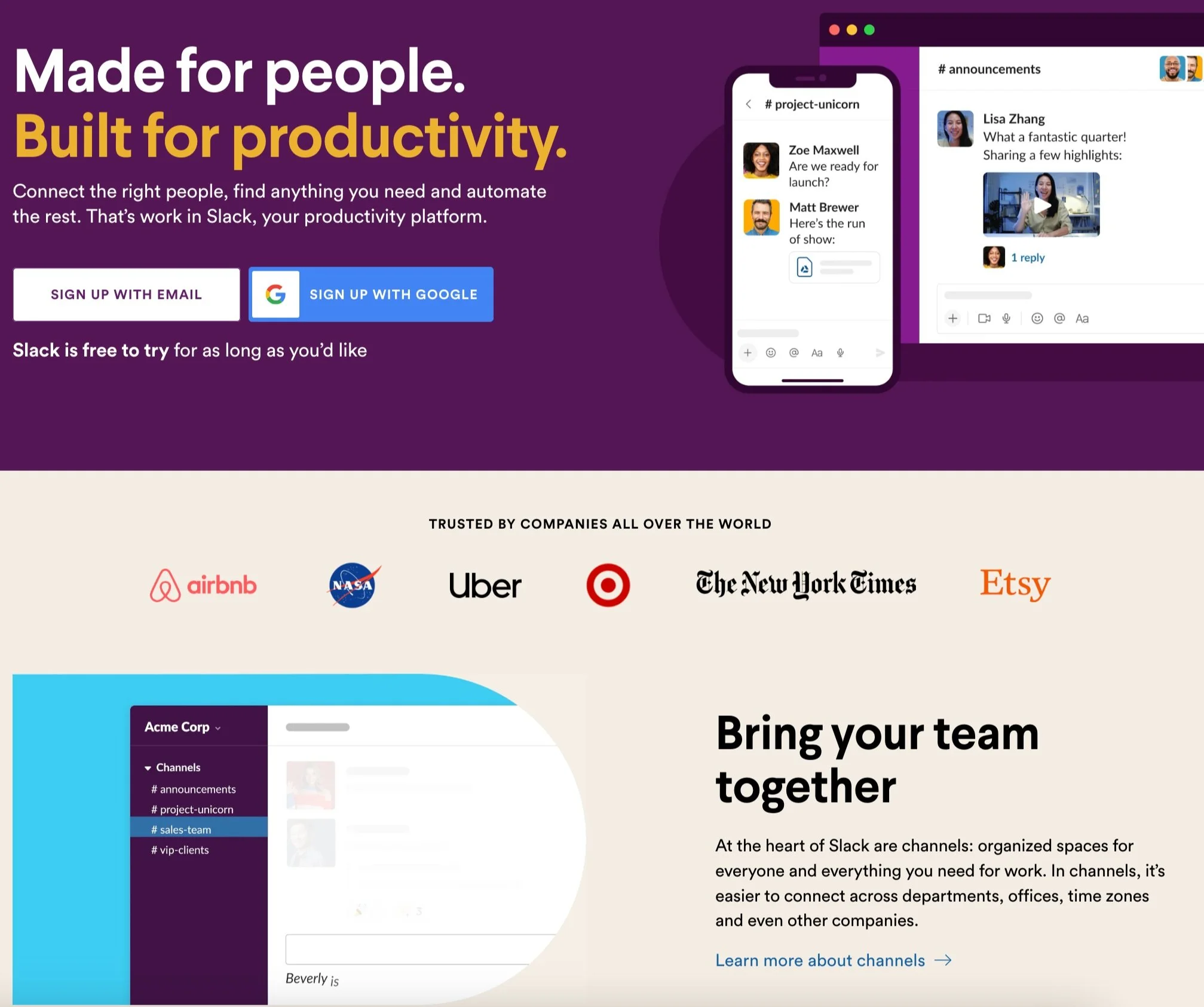 Slack's landing page is a great example because it plainly communicates its value proposition and encourages the reader to take action: sign up or learn more.