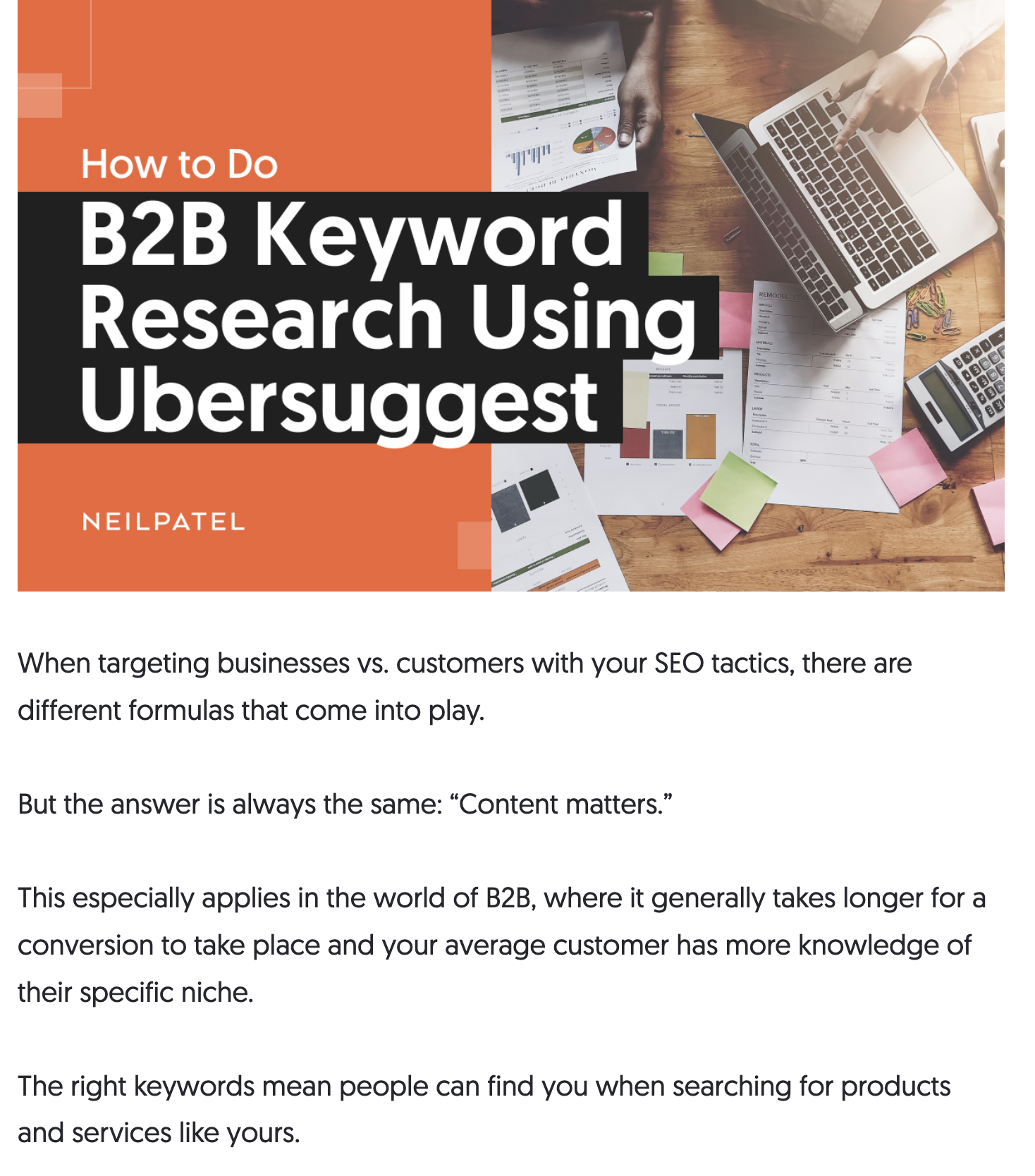 Neil Patel's blog consistently provides data-driven content, backed by extensive research and analysis. His blog article "How to Do B2B Keyword Research using Ubersuggest" teaches businesses and marketers how to use facts to inform your online marketing strategy. Neil knows his marketing audience well and caters to them.